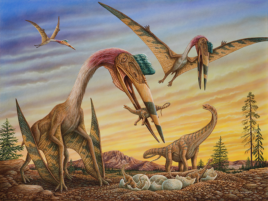 Dinosaur Scene Illustration Realistic dinosaur illustration – Quetzelcoastlus on the attack – airbrush illustration by Phil Wilson.