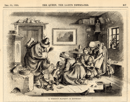 As most of us know the legend of St. Nicholas goes back hundreds upon hundreds of years to various European countries. He had different names depending on the country and some historians believe that a Bishop in Asia Minor became St. Nicholas as far back as 325 A.D.! Legend states that after his death on December 6 he was adopted as the patron saint of children and this became St. Nicholas Day. For centuries, children were visited on that night by a gift bearing old man with a long white beard who rode on a horse. Over the years he went through many name changes – Father Christmas, Pere Noel, etc. depending on country and religion and he also developed a split personality or alter ego – meaning he could either reward or punish. That brings me to my name – Knecht – and German heritage! In Germany, St. Nicholas’ alter ego was Knecht Rupert who rewarded good children with fruit but in most cases arrived to frighten the naughty ones. Maybe I’m related to him! Many years ago I acquired this original newspaper illustration of Knecht Rupert from the December 25, 1880 issue of The Queen – notice the frightened looks of two of the children!