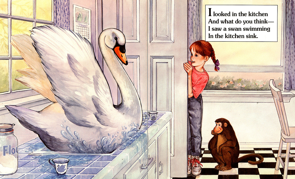 Swan in Kitchen Children’s Illustration Children’s book illustration – Swan In Kitchen – art by Carol Newsom.