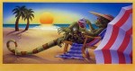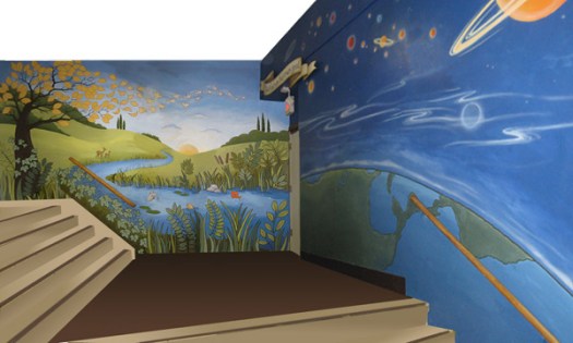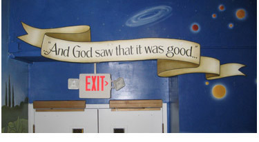 These church wall murals were created by Lyn Martin for the Grace Episcopal Church in Chattanooga, TN. The Grace priest contacted Lyn for the project in order to make the entrance more welcoming while taking something from Genesis (the Creation) and honoring older parishioners that worked to have the church building raised. Part of the artwork that Lyn created was inspired by a prayer during a service about “the planets in their courses and our island home, this planet earth.” Lyn painted the walls on site using Benjamin Moore wall paint and traditional acrylics for the details. A different task for an artist accustomed to using canvas board and a computer – especially painting most of the time on scaffolding!!